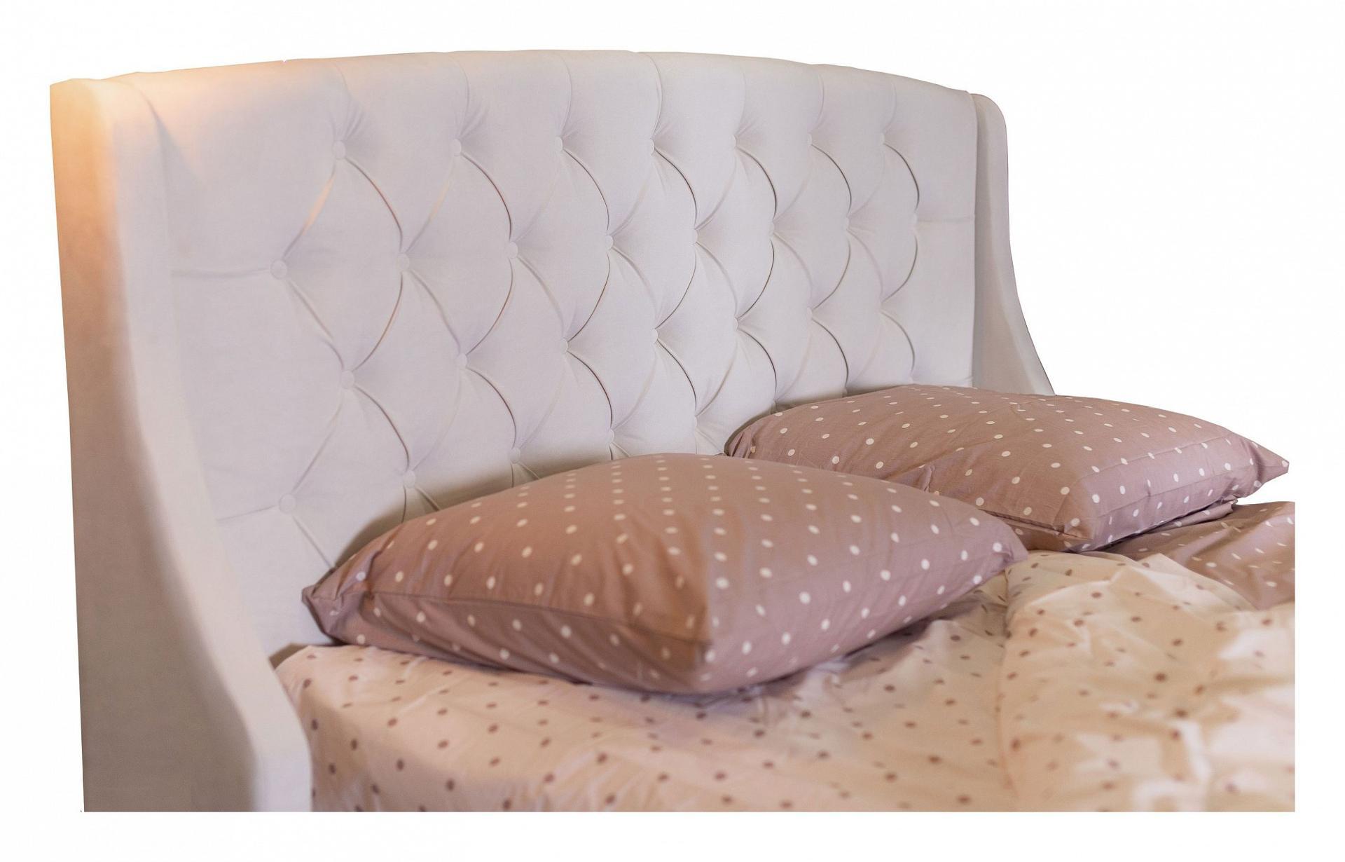 Основной акцент сделан на высоком изголовье с мягкими боковинами – “ушками”. Мягкая спинка изящно оформлены каретной стяжкой с декоративными пуговицами в тон изголовья.