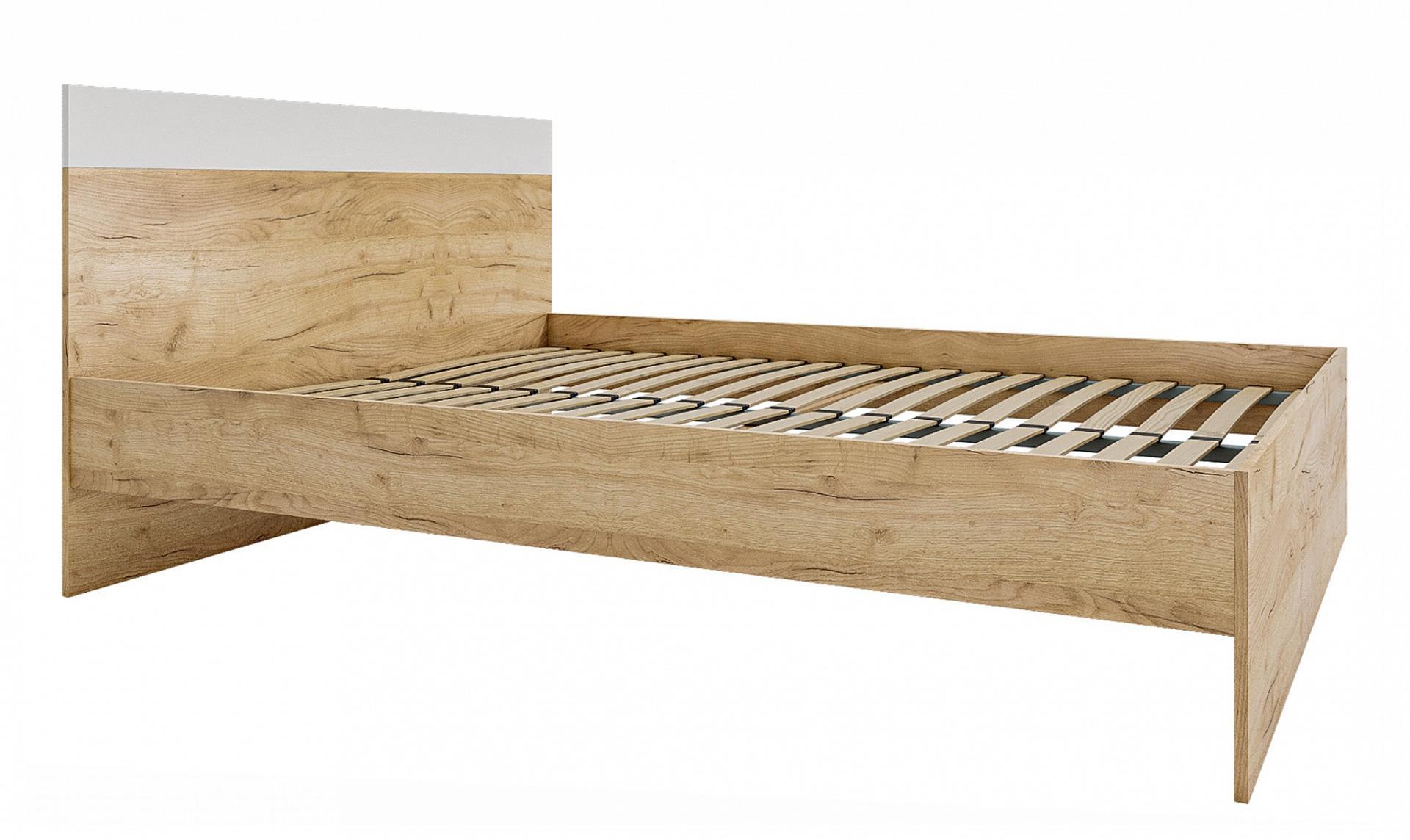 Изголовье кровати выполнено с сочетанием двух текстур – дуб золотой и белый.