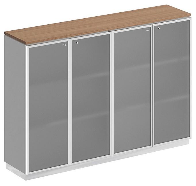 Тумба-витрина состоит из двух стеллажей топа, цоколя и стеклянных дверей в алюминиевой рамке.
