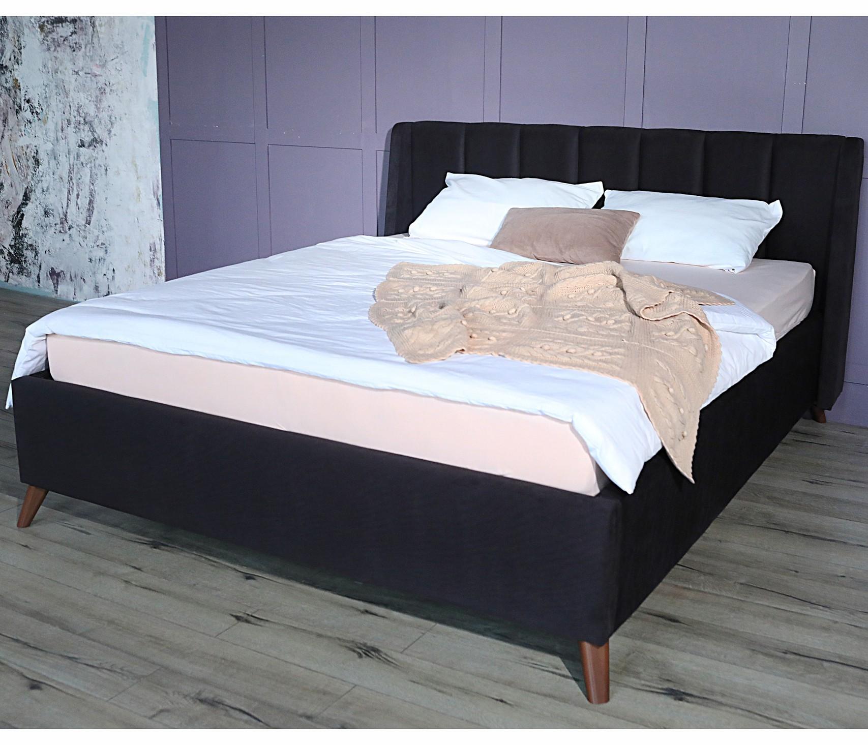 Кровать имеет рельефную мягкую спинку с неглубокими стяжками, которые придают особую изысканность изголовью. Обивка изголовья и весь периметр кровати выполнен из мебельной ткани – велюр. Ткань износостойкая, легко чиститься от загрязнений, практичная, эластичная, устойчивая к ультрафиолету.