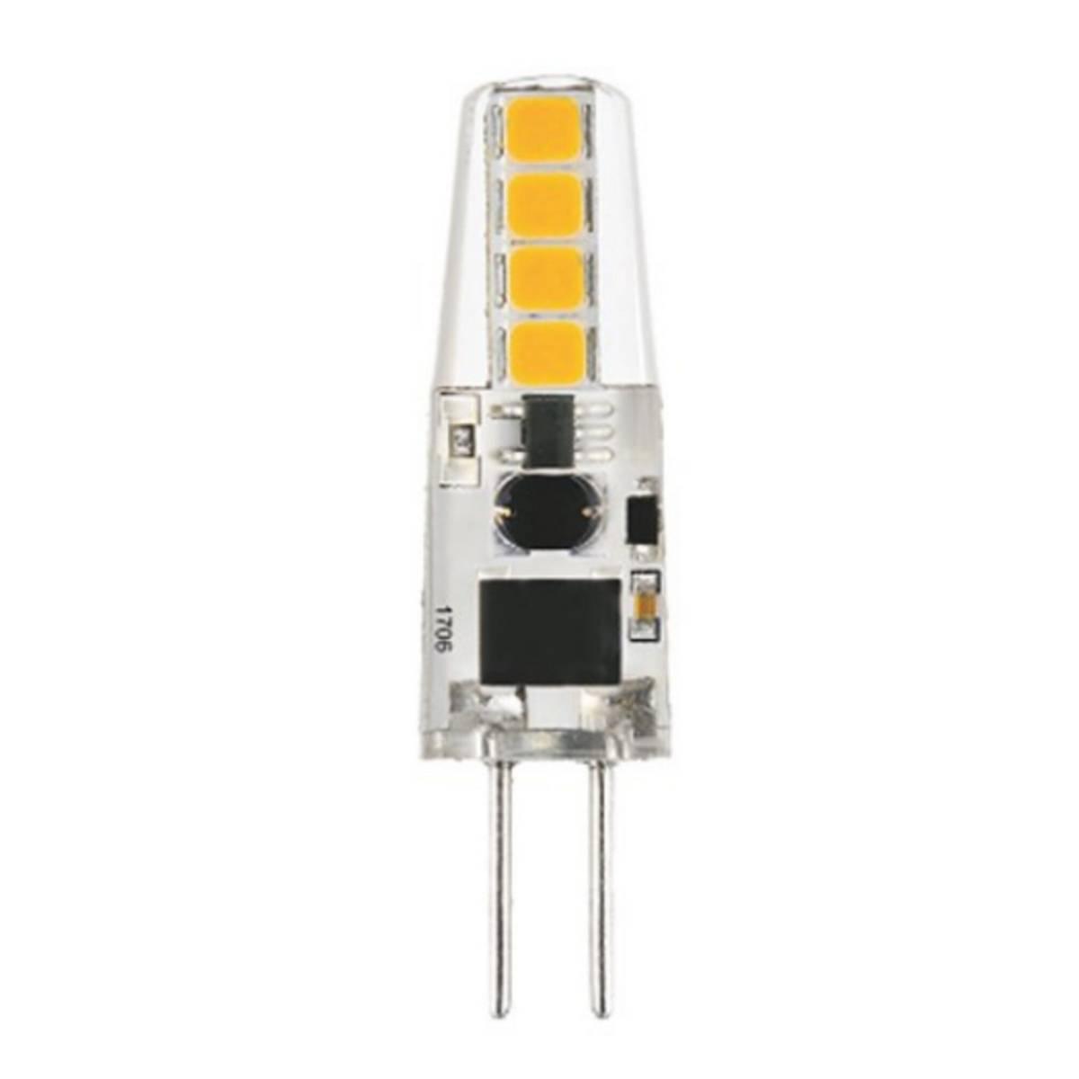 Светодиодная лампочка в форме колбы с цоколем G4 и размерами 38 мм по высоте и диаметром в 11 мм обладает мощностью в 2 W, благодаря чему она может осветить 0.7 кв. м. Цветовая температура – 4000K К, т.е. белый свет, подходящий для рабочего настроя (не рекомендуется для детской комнаты). Изделие рассчитано на использование в сети с переменным напряжением в 220В.