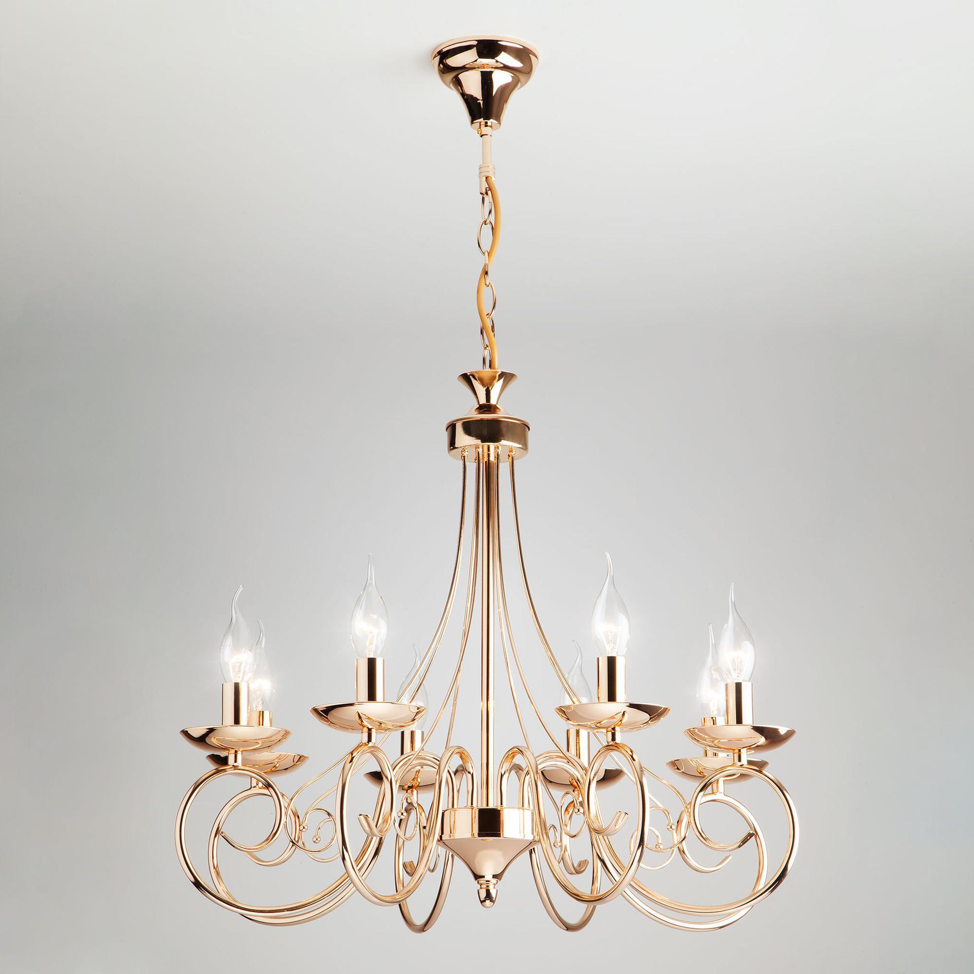 Классическая люстра с хрусталем на 8 рожков в цвете золото преобразит потолочное пространство и создаст в вашем помещении комфортное полноценное освещение на площади 38 м кв. Изящные формы и классический стиль добавят вашей гостиной утонченного аристократизма. Декоративные рожки в виде подсвечников, украшенные сменными лампами с цоколем E14 типа "свеча на ветру" переливаются на свету яркими завораживающими бликами. В производстве подвесной люстры использовали высококачественный металл с надежным защитным покрытием. В нашем интернет-магазине вы можете купить подвесную люстру по выгодной цене с доставкой по Москве и России.